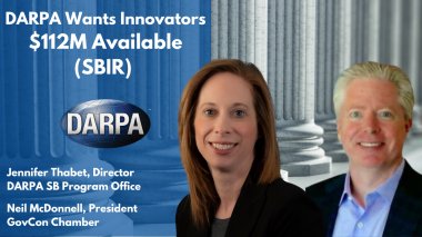 Join GovCon Chamber president Neil McDonnell in a fireside chat with Jennifer Thabet, Small Business Program Office Director for DARPA – the Defense Advanced Research Projects Agency and a champion for small business innovation.